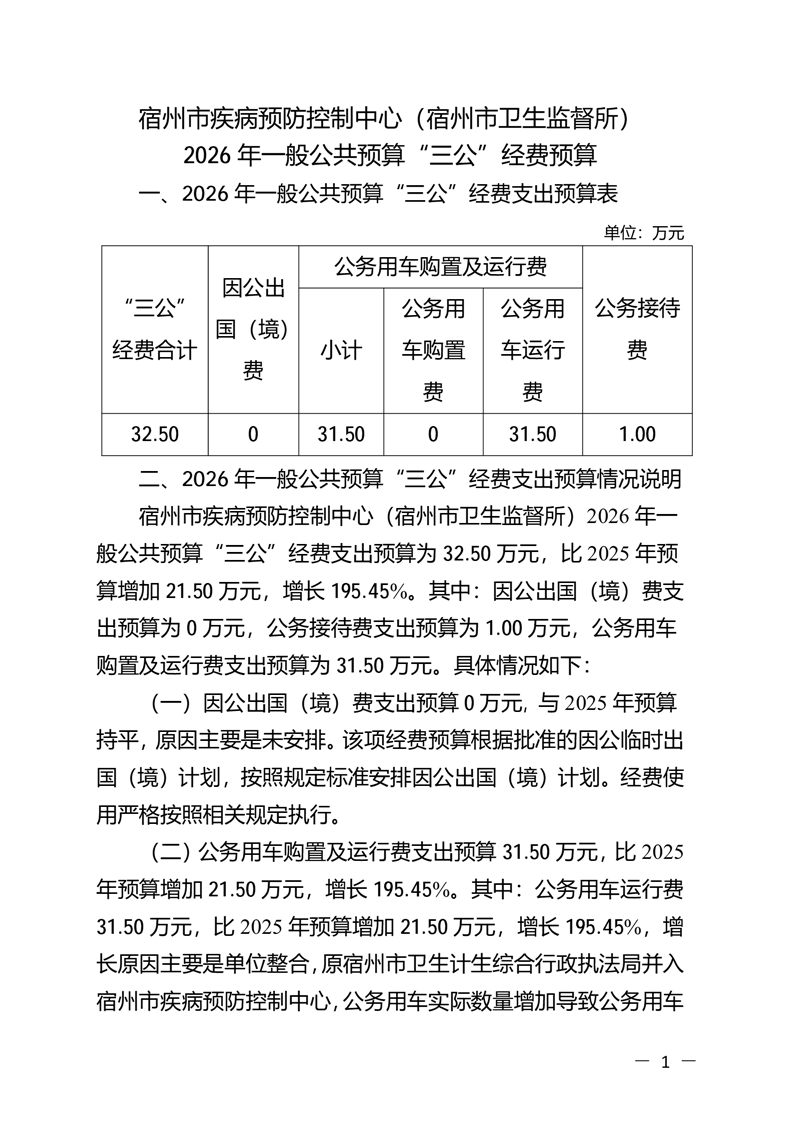 宿州市疾病预防控制中心(宿州市卫生监督所)2026 年一般公共预算“三公”经费预算